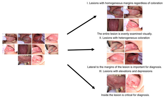 Furthermore, an innovative approach of classifying intraoral photographs based on gross features rather than the confirmed disease was introduced, which provided insights into the optimal examination methods and identification of key areas for diagnosis [21,22,23,24,25]. These gross features were categorized as uniform margins regardless of color tone (α), uneven color tone at the margins (β), and the presence of irregularities in the mucosa surface properties (γ).