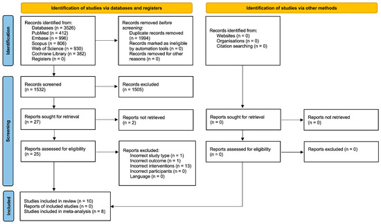 The search was conducted across multiple databases, yielding 3526 search results. Duplicate articles were subsequently removed, resulting in a total of 1532 articles. The articles were allocated to two reviewers to screen the titles and abstracts. Based on predetermined eligibility criteria, 1505 articles were excluded, leaving 27 for full-text review. Two of the studies were not retrieved, leaving a total of 25 articles to be assessed by the reviewers. Thirteen studies were excluded as the VR system was not fully immersive, one was excluded due to incorrect outcomes, and one was excluded because it was not a randomized controlled trial (Supplementary Materials S2). Finally, ten studies were included in the systematic review, and eight were included in the meta-analysis [12,25,26,27,28,29,30,31]. A PRISMA flow diagram was created to represent this process, as shown in Figure 1.
