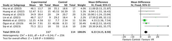 Seven studies [12,27,28,29,30,32,33] analyzed the effect of VR on upper-extremity function using the Fugl-Meyer Assessment. The findings of this meta-analysis (Figure 2) demonstrate a significant positive effect of VR interventions on upper-extremity function measured by the Fugl-Meyer Assessment compared to the control group (MD 6.33, 95% CI 4.15 to 8.50, I2 = 25%, p = 0.00001, 231 participants overall).