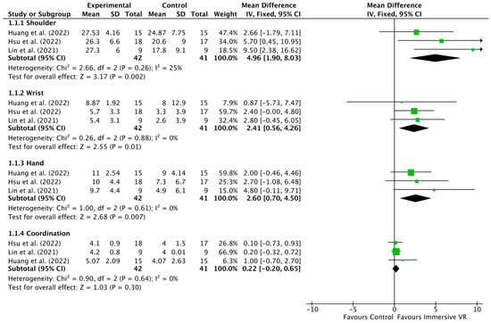 Three studies examined the effect of VR on shoulder function by using the Fugl-Meyer Assessment subscale [27,28,29]. The results show that shoulder function improved significantly in the VR group compared to the control group (MD 4.96, 95% CI—1.90 to 8.03, I2 = 25%, p = 0.002, 83 participants). Similarly, for the Fugl-Meyer Assessment wrist subscale, there is a statistically significant improvement in wrist outcomes for the VR group compared to the control group (MD 2.41, 95% CI—0.56 to 4.26, I2 = 0%, p = 0.01, 83 participants). Regarding the hand subscale, there is a statistically significant improvement in hand outcomes for the VR group compared to the control group (MD 2.60, 95% CI—0.70 to 4.5°, I2 = 0%, p = 0.007, 83 participants). Finally, the meta-analysis for coordination did not show a significant difference between the VR and control groups (MD 0.22, 95% CI –0.20 to 0.65, I2 = 0%, p = 0.30, 83 participants).