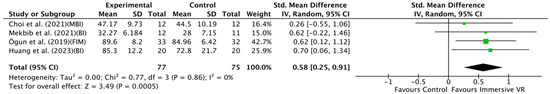 The results shown in Figure 4 from the four studies [12,26,30,32] that analyzed the impact of VR therapy on ADLs highlight that VR interventions had a significant positive effect on ADL outcomes compared to the control group (SMD 0.58, 95% CI 0.25 to 0.91, I2 = 0%, p = 0.0005, 152 participants).