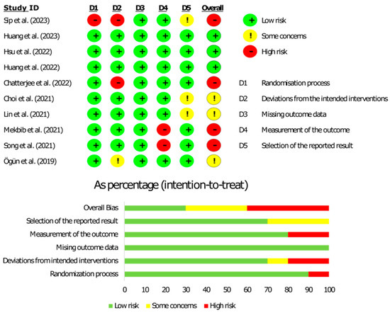 For each of the ten randomized controlled trials included in this systematic review, the risk-of-bias assessment is shown in Figure 5 and Table S1 (Supplementary Materials S3). The randomization process and missing outcome data were considered to have a low bias risk for nine studies and a high risk for one study. Participants were all randomly allocated using a sequence generation process, with independent enrollment personnel controlling the allocation process. Studies did not show missing data for all participants randomly allocated. The selection of the reported results was examined, and the risk of bias was found in three papers [26,29,33] to be of some concern due to a lack of trial registration. Two studies had a high risk of bias in measuring the outcome [30,31]. The assessors could have impacted the outcome, and the outcome measurement could have differed between groups. Deviations from the intended intervention were reported as having a high risk of bias for two out of ten studies [25,33] and being of some concern for one out of ten studies [11] due to deviations from the intended intervention that could have affected the outcome. Overall, three out of ten studies were marked as low risk [27,28,32], three out of ten studies were considered to have some concerns of bias [12,26,29], and four out of ten studies were determined to have a high risk of bias [25,30,31,33]. Figure S1 (Supplementary Materials S3) illustrates the funnel plot of the included studies.