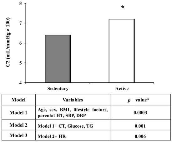 Baseline small-artery compliance in sedentary (n = 264) and active (n = 102) stage I hypertensive subjects from the HARVEST study. Adapted from Saladini F et al. [12]. BMI, body mass index; lifestyle factors: smoking habits, alcohol and coffee consumption and physical activity; parental HT, parental hypertension; SBP, systolic blood pressure; DBP, diastolic blood pressure; CT, total cholesterol; Tg serum triglycerides; HR, heart rate. p * value adjusted for age and sex.