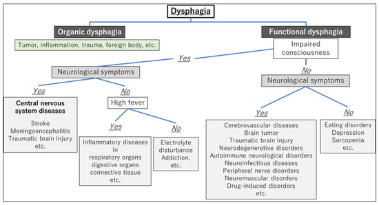Formulating differential diagnoses for swallowing disorders involves distinguishing among various conditions that can lead to impaired swallowing function. Dysphagia is categorized into organic swallowing disorders (static dysphagia) and functional swallowing disorders (dynamic dysphagia). Organic dysphagia results from structural abnormalities such as tumor lesions or inflammatory conditions extending from the oral cavity to the esophagus. It can also manifest as mechanical impediments to bolus passage due to irregularities in the passage or compression from the surrounding tissues. In contrast, functional dysphagia is characterized by normal anatomy but abnormal bolus transport function from the oral cavity to the esophagus. Other potential causes include eating disorders and psychiatric conditions [3,4]. Neurological disorders mainly present with functional dysphagia [7,8,9]. A comprehensive assessment of the patient’s symptoms and clinical findings is essential to accurately diagnose the underlying cause of dysphagia.