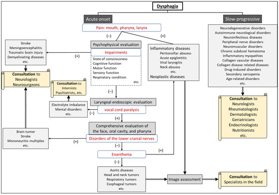 After differentiating whether dysphagia is organic or functional, a flowchart for evaluating the underlying cause of dysphagia, based on the presence of consciousness disorders, is illustrated in Figure 1. A flowchart for differentiating the causative disease of dysphagia according to whether the course of dysphagia is acute in onset or slowly progressive is shown in Figure 2. In patient assessments, it is essential to prioritize a comprehensive interview, encompassing the current and past medical history, family background, medication usage, and other pertinent details, before proceeding to a meticulous evaluation of the oral and pharyngeal regions. Thorough psychosomatic assessments are highly important.