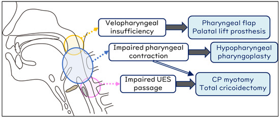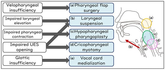 Figure 3 details the association between the specific site of swallowing dysfunction and the corresponding surgical procedures. For velopharyngeal insufficiency, pharyngeal flap surgery is considered [78]; for impaired laryngeal elevation, laryngeal suspension (elevation) (with infrahyoid myotomy) [73,75,79]; for impaired pharyngeal contraction, hypopharyngeal pharyngoplasty [80]; for impaired UES opening, cricopharyngeal myotomy (with laryngeal suspension) [73,75,76,77]; and for glottic insufficiency, vocal cord medialization [81,82] is contemplated.