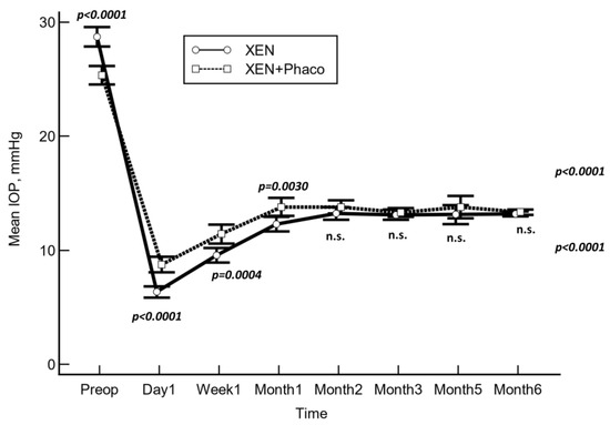 Mean intraocular pressure (IOP) over the course of follow-up in the XEN solo and XEN+Phaco groups. The vertical bars represent the 95% confidence interval. Mean IOP was significantly lower in the XEN solo group at day 1, week 1, and month 1, but no significant differences were observed at any of the other IOP time points measured (statistical significance was determined using the one-way ANOVA test with Scheffé’s method). n.s.: Not significant.