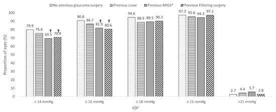 As compared to those eyes that did not undergo previous glaucoma surgery, the proportion of eyes achieving a final IOP ≤ 14 mmHg and ≤16 mmHg was significantly lower in the eyes that underwent a previous MIGS device procedure and previous filtering surgery (Figure 2).