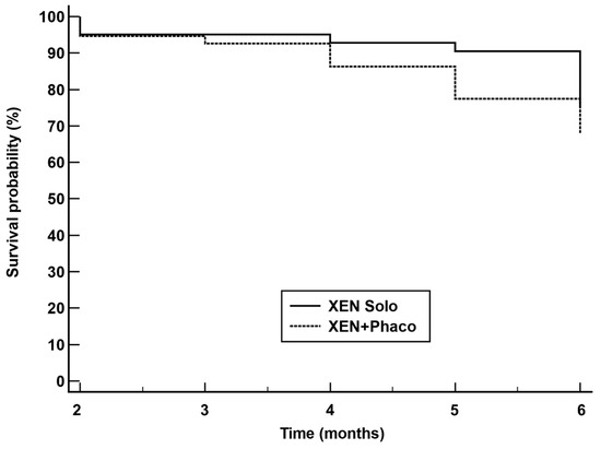 The Kaplan–Maier survival analysis found that survival probability was higher in the XEN solo group than in the XEN+Phaco one (p = 0.0459) (Figure 3).