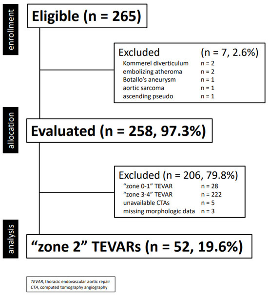 This is a single center, retrospective, financially unsupported physician-initiated cohort study [17]. Clinical data were collected in a dedicated, anonymized institutional database and analyzed retrospectively. Information collected included demographics, co-morbidities, morphologic characteristics of the aortic lesion, type of intervention and endograft, as well as postoperative events (complications, death, reintervention) during hospitalization and follow-up. For this study, only TEVAR performed between 16 February 2007 and 10 January 2023 were extracted and included in the final cohort according to the following criteria (Figure 1):