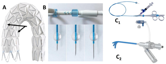 The two different waves (black arrows) of the nitinol frame of then AnkuraTM endograft (A). FuThroughTM needle system (B,C1) adjustable in length. FustarTM (C2) steerable sheath.