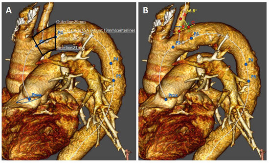 Preoperative imaging evaluation of the aortic arch morphologic features: proximal landing zone lengths (A) and angulation of the left subclavian artery take-off (B).