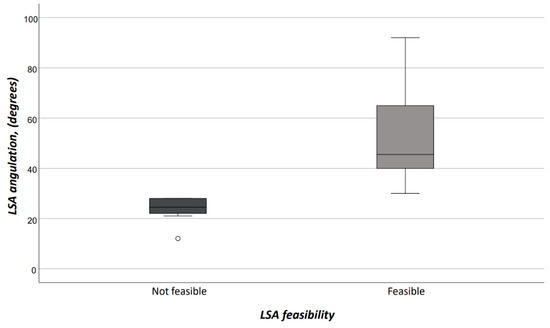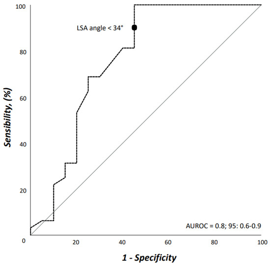 Interobserver agreement on both access vessels and aortic arch morphologic features was high (r = 0.98). Demographics, comorbidities, and risk factors are reported in Table 1. There were no differences between patients who would have received TEVAR with ISF using the Ankura™ device, and those who would have been considered unfit for this type of TEVAR; in particular, there was no difference in patients potentially treated in urgent/emergent scenarios [n = 12 (37.5%) vs. 5 (25.0%), OR: 1.8, p = 0.383]. The differences of morphologic features in the two groups are summarized in Table 2. Considering the size of the device that should have been implanted at the index procedure, the overall access-vessel correlated feasibility rate of TEVAR using the Ankura™ device would have been 98.1% (51/52). The patient with no morphological requirement for TEVAR with this device would have required an aorto-bifemoral bypass graft to overcome this anatomical issue as indeed originally occurred during index TEVAR. The mean aortic endograft size was 32 mm ± 4 (range, 25–42) during the index TEVAR, and 36 mm ± 4 (range, 28–46) if TEVAR with the ISF using the Ankura™ device would have been used. No case would have been rejected for ISF TEVAR. Out of the 20 (38.5%) cases considered unfit for ISF, there were 11 (55.0%) cases of type III aortic arch, 5 (25.0%) type II aortic arch, and 4 (20.0%) type I aortic arch (p = 0.359). The presence of an aberrant left vertebral artery in 4 (7.7%) patients would have not ruled out the possibility of performing a TEVAR with the ISF that, however, would have required the transposition of the left vertebral artery as indeed happened in the index TEVAR. Considering all morphologic features, ISF TEVAR using the Ankura™ device would have been 61.5% (32/52). Binary logistic regression analysis showed that LSA angulation (OR: 1.1, 95%CI: 1.03–1.14, p = 0.003) negatively impacted ISF with this technique. The AUROC analysis showed a fairly good discrimination for this multivariable model (Figure 5). In particular, an LSA angle of 34° yielded a 91% sensitivity and 45% specificity, equaling an 78.6% positive predictive value with an accuracy of 76.9% (Figure 6).
