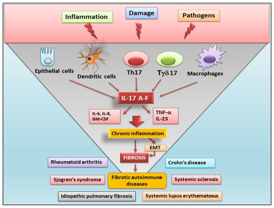 Role of IL-17 cytokines in fibrotic autoimmune diseases IL-17 is produced by epithelial cells, dendritic cells, macrophages, CD4 T helper 17 (Th17), and gamma/delta T cells (Tγδ17 cells). IL-17 signaling promotes the production of pro-inflammatory factors such as granulocyte-macrophage colony-stimulating factor (GM-CSF), tumor necrosis factor (TNFα), and the release of pro-inflammatory cytokines such as IL-6, IL-8, and IL-23. These pathogenic factors exacerbate chronic inflammation and, often through the epithelial-mesenchymal transition (EMT) process, cause the fibrotic evolution of autoimmune diseases.