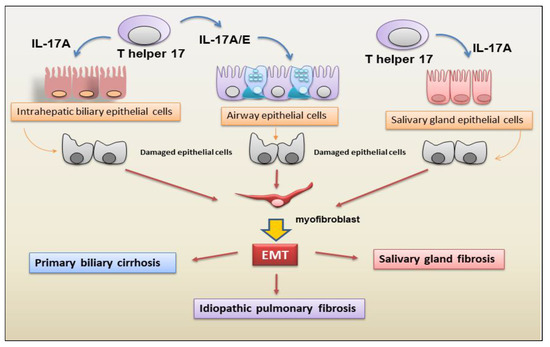 All fibrotic tissues exhibit characteristics of chronic immunologically-mediated inflammatory status during the initial periods of their development. IL-17 is expressed in an altered manner in several autoinflammatory diseases. Indeed, in inflammatory chronic conditions such as liver cirrhosis, idiopathic pulmonary fibrosis, and heart failure, IL-17 contributes to the severe fibrotic process through various mechanisms, including the induction of resident stromal cells and the progression of the inflammatory status. In liver fibrosis, IL-17, operating in synergy with IL-1β, IL-6, and IL-23, continues the inflammatory process by promoting transforming growth factor-β (TGFβ) expression in hepatic stellate cells [48,49]. IL-17 stimulates the hepatocytes, involved in fibroblast activation and collagen release, to secrete periostin [50]. Accordingly, inactivation of IL-17 signaling in hepatocytes diminished the fibrotic process in the liver of murine models affected by hepatitis-induced liver injury [51]. Therefore, IL-17 is markedly expressed in the bronchial mucosa of patients affected by severe asthma and drives the epithelial-to-mesenchymal transition (EMT) process when used to induce human small airway epithelial cells in in vitro cultures [52]. Supporting the involvement of IL-17 in EMT-dependent fibrosis, Sisto et al. recently demonstrated that IL-17, through the support of IL-22, contributes to triggering the EMT-dependent fibrotic process in healthy human salivary gland epithelial cells, clarifying the role of IL-17 in the fibrotic evolution observed in SS [53]. It is interesting to note that, in patients with idiopathic pulmonary fibrosis (IPF), Th17 cells secrete TGFβ and IL-17A at high levels; in addition, when lung fibrosis was induced in vitro through bleomycin (BLM) treatment of a murine model or when Th17 cells were cultured simultaneously in the presence of human lung fibroblasts, an increase in collagen deposition and other ECM factor production was revealed [54]. Indeed, blocking IL-17 improves the fibrotic condition in the lung of murine models affected by pulmonary disease following a post-bone marrow transplant [54]. Finally, IL-17 secreted by γδ T cells and Th17 cells plays a key role in several conditions of heart fibrosis, probably involving various inflammatory events in these organs. In fact, IL-17 induces cardiac myofibroblast transformation in murine models, in which ischemia causes heart injury, as well as in experimental models of hypertension [55]. Blockade of the IL-17 signaling pathway reduces cardiac fibrosis and improves myocardial contractile function [56]. A schematic representation of the role of IL-17 in autoimmune-related fibrosis is reported in Figure 1.