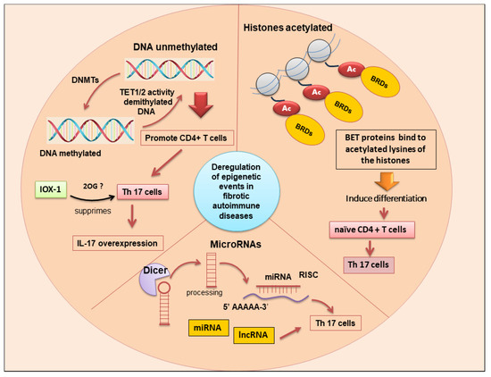 Dysregulated Th17 cell responses contribute to the immunopathogenesis of multiple inflammatory and autoimmune diseases [81]. Following aberrant activation stimuli, T helpers appear to be involved in triggering autoimmune responses against many organs, such as joints, brain, skin, gut, pancreas, salivary and lachrymal glands, and the eye. This abnormal and persistent activation leads to the onset of multiple autoimmune diseases, including multiple sclerosis (MS), psoriasis, Cröhn’s disease, type I diabetes, SS, uveitis, systemic sclerosis (SSc), and SLE [82]. It is now accepted that the fibrotic evolution of autoimmune diseases presents an excessive release of pro-fibrotic factors as a result of the activation of molecular cascades depending on chronic inflammation, and the recent challenge consists of identifying anti-fibrotic therapies that can also have value in autoimmune diseases. Previous research has significantly increased our understanding of genetic susceptibility to fibrotic diseases based on the identification of sequence variants, polymorphisms, and mutations in several genes [83,84]. However, the concordance rate for some fibrotic diseases in monozygotic twins is low, indicating that genetic predisposition is insufficient to explain disease development and suggesting a potential role of epigenetics as the missing link that connects environmental exposure to disease development [85]. The following paragraphs explore findings related to the epigenetic regulation of IL-17 in fibrosis.