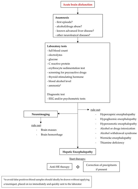 - Weissenborn, K. Hepatic Encephalopathy: Definition, Clinical Grading and Diagnostic Principles. Drugs 2019, 79 (Suppl. S1), 5–9. [Google Scholar] [CrossRef]