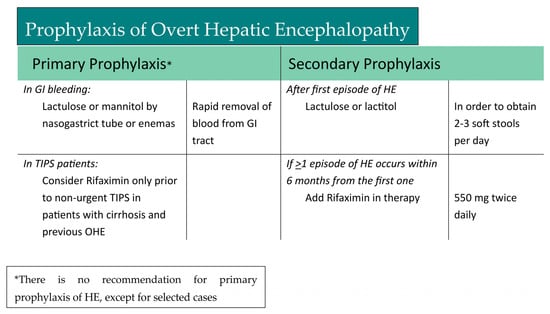 - Wen, J.; Liu, Q.; Song, J.; Tong, M.; Peng, L.; Liang, H. Lactulose is highly potential in prophylaxis of hepatic encephalopathy in patients with cirrhosis and upper gastrointestinal bleeding: Results of a controlled randomized trial. Digestion 2013, 87, 132–138. [Google Scholar] [CrossRef] [PubMed]