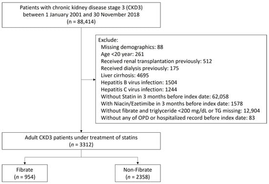 This study aims to determine the role of fibrate in CKD 3 patients with concurrent statin treatment. The diagnosis of stage 3 CKD was indicated by 2 consecutive records of estimated glomerular filtration rate (eGFR) between 30 and 60 mL/min/1.73 m2 at least 3 months apart, and the second date of eGFR was defined as the index date. The flow of patient selection is depicted in Figure 1. We focused on comparing outcomes between patients with fibrate and statin combined and patients with statin alone. Thus, patients without receiving statins were excluded. To reduce interference from the other effects of lipid-lowering agents, patients who received other lipid-lowering agents, such as ezetimibe and niacin, in the 3 months preceding the index date, were excluded as well, although excluding these patients reduced the overall number of participants and may have potentially decreased the statistical power of our study. Patients with normal TG levels (TG < 200 mg/dL) in the non-fibrate group were excluded to reduce confounding by indication. We focused on adult CKD patients, so patients under the age of 20 were excluded.