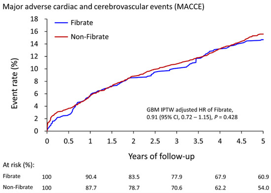 After five-year follow-up, Table 2 shows that the fibrate group exhibited only a significantly lower incidence of AMI (4.4% vs. 5.4%, HR: 0.77, 95% CI: 0.61 to 0.98). The risk of MACCEs (14.7% vs. 15.6%, HR: 0.91, 95% CI: 0.72 to 1.15), all-cause mortality (5.7% vs. 6.1%, HR: 0.91, 95% CI: 0.63 to 1.30), ischemic stroke (9.2% vs. 8.9%, HR: 1.02, 95% CI: 0.85 to 1.22), and CV death (3.2% vs. 3.8%, HR: 0.81, 95% CI: 0.50 to 1.29) did not significantly differ between the two groups. The cumulative event rates of MACCEs are illustrated in Figure 2.