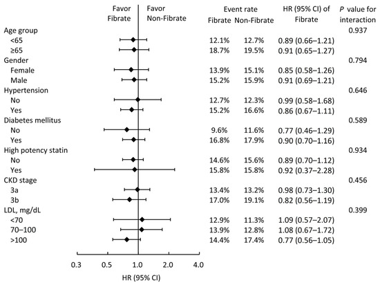 Fibrate, a peroxisome proliferator-activated receptor alpha agonist, effectively reduces TG levels and increases HDL-C levels [17]. It also modulates several crucial lipoproteins metabolism, especially decreasing the formation of apolipoproteins C-III [24] that inhibit lipolysis, and increases the production of apoA-I and apoA-II [25], which are the major lipoproteins of HDL-C. In the general population, most previous large-scale RCTs have shown limited or no benefits of fibrate in preventing CV events [17]. Furthermore, combining fibrate with statin could not provide additional benefits in the general population compared with those with statin treatment alone when it came to outcomes of CV events [18,26]. In patients with CKD and marked proteinuria, alterations in metabolic processes lead to hypertriglyceridemia and low HDL-C levels, which become the hallmarks of dyslipidemia [27]. However, the increase in the levels of LDL still act as crucial contributing factors in inducing atherosclerosis, while HDLs act as protective factors [28]. These metabolic alterations, which might influence the role of fibrate in CKD patients and warrant further investigation, could potentially elucidate the subgroup analyses with different LDL-C levels, suggesting that the CV beneficial effects of fibrate treatment appear less pronounced in patients with lower LDL-C levels.
