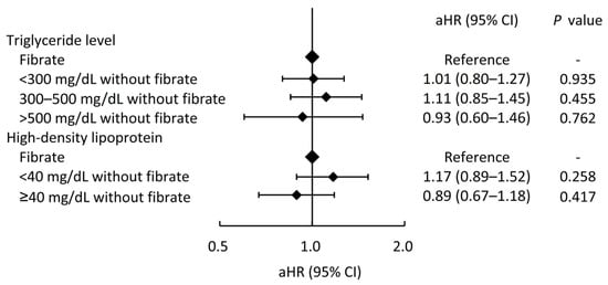 In addition, we also compared whether the fibrate usage is more strongly associated with a lower risk of MACCEs in patients with higher TG levels or with lower HDL-C levels (the fibrate group was taken as a reference group), as shown in Figure 4. For patients treated with statin alone, the MACCEs risks did not significantly change across patients with different TG or HDL-C levels compared to the patients with concurrent fibrate and statin therapy. On the other hand, the different TG levels in the fibrate group also had no apparent impact on the CV outcomes compared to the non-fibrate group (Supplemental Table S2).