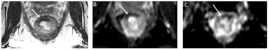 On the other hand, “T2 dark-through” is when extensive post-treatment fibrosis results in a low signal on the ADC map. This phenomenon results in part from the high collagen content of fibrosis. To avoid this, the reader should correlate the low signal seen on the ADC map with the signal on DWI and T2-weighted imaging; if the signal is low on all sequences, then it should be interpreted as fibrosis (Figure 7) [].