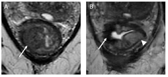 - T2-weighted imaging—In T2-weighted imaging, CR can be represented as a linear or crescent-shaped scar within the mucosal/ submucosal layers or even the normalization of the rectal wall. It is known that rectal wall normalization can be seen in 5% of cases and is suggestive of CR [].