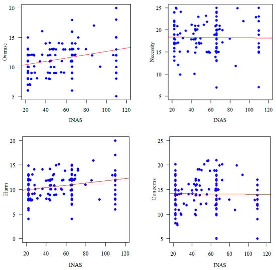 The overuse (r = 0.330, p < 0.0010) and harm (r = 0.27, p = 0.001) subscale of the BMQ were significantly correlated with INAS scores (Figure 1).