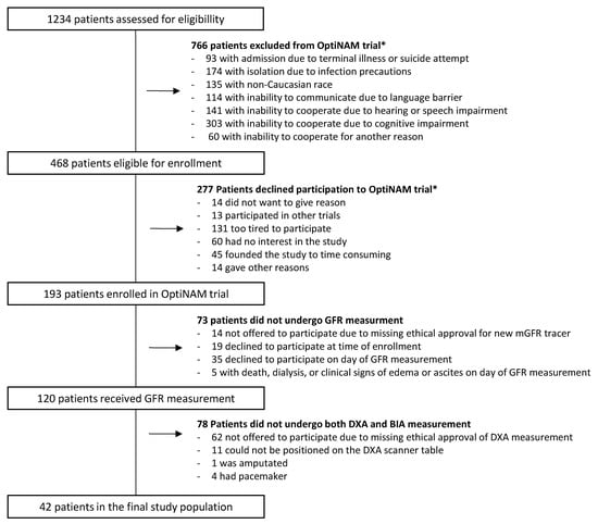 In this protocolized prospective exploratory cohort study, we examined data from a subpopulation of the randomized clinical trial, OptiNAM, investigating the effect of optimizing nutrition and medication in acutely admitted older patients registered at Clinical Trials.gov (NTC03741283). A detailed description of the study design can be found elsewhere [21,22]. Patients were recruited at the ED at Copenhagen University Hospital, Hvidovre, Denmark. The ED annually handles 12,600 acute admissions. Patients enrolled in the original study were additionally invited to a sub-study where they received a glomerular filtration rate measurement (mGFR) and an estimation of muscle mass based on MF-BIA and DXA measurements. This study is based on data from the above-mentioned sub-study. The reporting of this study follows the “Strengthening The Reporting of Observational studies in Epidemiology (STROBE)” guidelines [23].