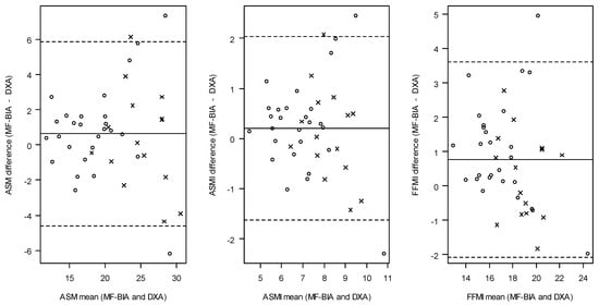 Bland–Altmann plots for agreement between ASM, ASMI, and FFMI estimated by MF-BIA and DXA (absolute values). Dots show females, and crosses show males. Dashed lines represent the limits of agreement, and plain lines represent the mean bias. Abbreviations: MF-BIA: multi-frequency bioelectrical impedance analysis, DXA: dual-energy X-ray absorptiometry, ASM: appendicular skeletal muscle mass, ASMI: appendicular skeletal muscle mass index, FFMI: fat-free mass index.
