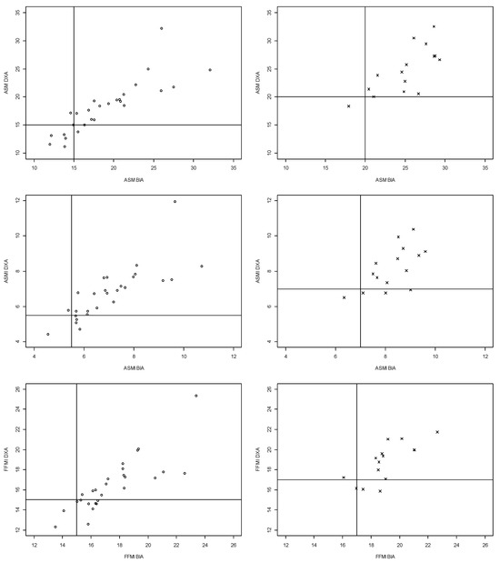 Scatter plots for agreement between ASM, ASMI, and FFMI estimated by MF-BIA and DXA (absolute values and low muscle mass). Dots show females, and crosses show males. Solid lines represent the cut-off values for low muscle mass. Abbreviations: ASM: appendicular skeletal muscle mass, DXA: dual-energy X-ray absorptiometry, MF-BIA: multi-frequency bioelectrical impedance analysis, ASMI: appendicular skeletal muscle mass index, FFMI: fat-free mass index.