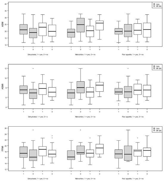 Figure 4 indicates that patients with dehydration had higher median values of ASM, ASMI, and FFMI, as measured by MF-BIA and DXA. Further, patients with malnutrition appeared to have lower median values of ASM, ASMI, and FFMI, as estimated by both MF-BIA and DXA (Figure 4). Lastly, median values of ASM, ASMI, and FFMI for both MF-BIA and DXA appeared to be similar regardless of normal or poor appetite (Figure 4).