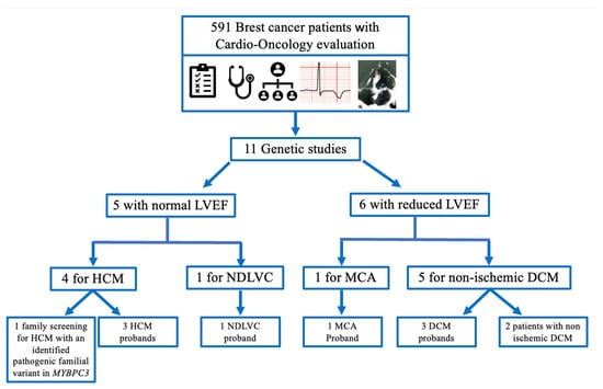 - Moghadasi, S.; Fijn, R.; Beeres, S.L.M.A.; Bikker, H.; Jongbloed, J.D.H.; Josephus Jitta, D.; Kroep, J.R.; Lekanne Deprez, R.H.; Vos, Y.J.; de Vreede, M.J.M.; et al. Case series, chemotherapy-induced cardiomyopathy: Mind the family history! Eur. Heart J. Case Rep. 2021, 5, ytab333. [Google Scholar] [CrossRef] [PubMed]