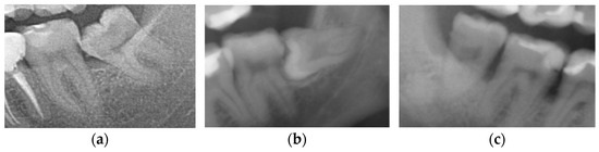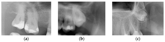 Third molars depending on the eruption status: (a) non-impacted (erupted) M3, (b) partially impacted M3, and (c) completely impacted M3.