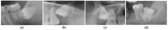 Additionally, M3s were categorized based on Winter’s classification in terms of their position in the dental arch relative to the long axis of M2s, according to the following criteria: (1) horizontal (angle between the long axes of an M2 and an M3 between 80° and 100°), (2) mesioangular (from 10° to 80°), (3) vertical (from −10° to 10°), and (4) distoangular (from −10° to −80°) (Figure 3) [23].
