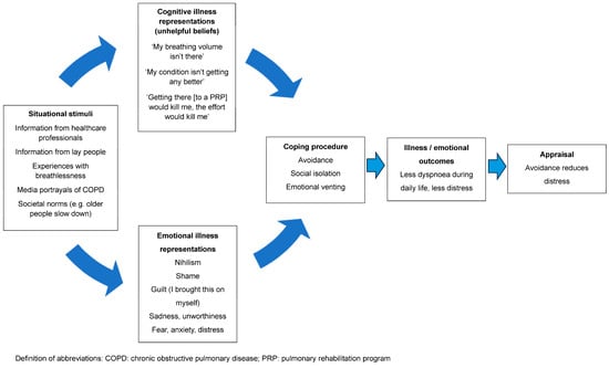 Despite the evidence, implementation of these programs is problematic [28]. A recent study completed by our group demonstrated that the proportion of people with COPD who were both eligible and appropriate for referral to a PRP who actually went on to be referred to this intervention was only 47% [20]. Even fewer people will complete a program [29]. Efforts to address this issue have focused on overcoming practical matters, such as difficulties with transport and parking costs, or the inflexibility of program availability, leading to difficulties fitting it in around work or career commitments. This has resulted in studies exploring new models of delivery to improve access, such as telerehabilitation and low-cost, home-based models [30]. Little attention has been given to unhelpful beliefs and the associated emotional responses to dyspnoea (e.g., distress, fear or anxiety), which may result in low uptake of referrals and high program attrition. Our earlier study identified that those who were appropriate for a referral to a PRP but did not go on to be referred were characterised by having less interest in a program [20]. When probed about their lack of interest, people expressed unhelpful beliefs that shaped their personal construct of dyspnoea and described these as barriers to accepting a referral to a PRP. Using the CSM, the interaction between these unhelpful beliefs, avoidant coping strategies and health outcomes is depicted in Figure 1.