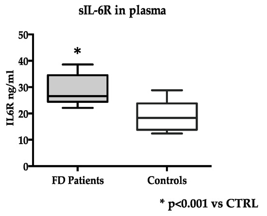 At variance, the levels of soluble IL-6R in plasma were significantly higher in FD (n = 20) than in control subjects (n = 15): 28.0 ± 5.4 ng/mL vs. 18.9 ± 5.4 ng/mL, p < 0.0001 (Figure 1).