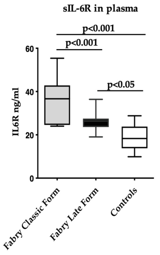 Soluble IL-6R levels were higher in FD subjects with the classical form (n = 6) as compared to FD with the late-onset form (n = 14) (36.0 ± 11.4 ng/mL vs. 26.1 ± 4.5 ng/mL, p < 0.0001) (Figure 2).