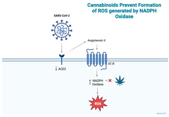 ACE2, which is involved in viral entry, also plays a role in the induction of redox stress. SARS-CoV-2 infection reduces cell membrane ACE2 expression, leading to the accumulation of its primary substrate, angiotensin II (Ang II). Ang II binds the Ang II type 1 receptor (AT1R) and induces ROS production through nicotinamide adenine dinucleotide phosphate (NADPH) oxidase in the brain, vasculature, and kidneys (Figure 2) []. Thus, elevated Ang II causes increased AT1R activation, which contributes to increased ROS levels [,]. Cannabidiol (CBD), a phytocannabinoid that acts through the CBR2 receptor, has been shown to affect redox balance. Like other antioxidants, CBD interrupts free radical chain reactions, transforming free radicals into less active forms []. CBD has been shown to downregulate oxidative conditions by preventing the initiation of superoxide radicals produced by NAPDH oxidase and xanthine oxidase []. Studies by Pan et al. (2009) showed that CBD reduced oxidative conditions by preventing the formation of superoxide radicals generated by NADPH oxidase in a murine model of cisplatin-induced nephropathy [].