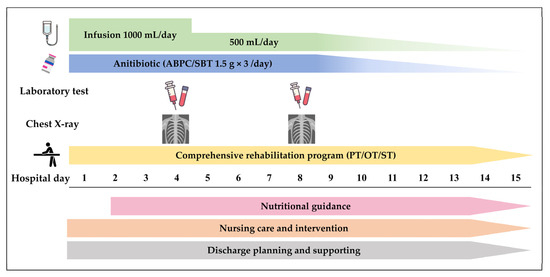 The CPW was constructed according to previously proposed operational definitions [7]; the design and components are shown in Figure 1. CPW implementation was determined arbitrarily by the attending physician on admission. Patients in the CPW group received 1000 mL of infusion and 1.5 g × 3 per day (every 8 h) of ampicillin/sulbactam (ABPC/SBT) as an initial antibiotic agent from hospital days 1 to 8. Blood tests and chest radiography were performed on hospital days 4 and 8 to assess treatment efficacy. The CPW also encompassed comprehensive care programs regarding nursing care, oral hygiene, nutrition support, multidisciplinary rehabilitation, and hospital discharge support. The attending physician could modify all interventions in the CPW as needed. Patients in the non-CPW group received treatment at the discretion of their attending physician. Antibiotic regimens, testing for efficacy assessment, and timing of multidisciplinary care interventions were determined by an attending physician.