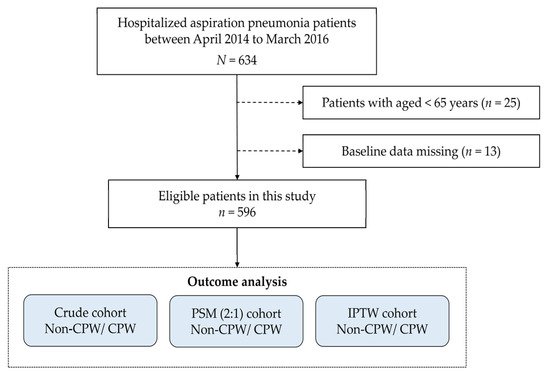 This was a retrospective analysis that included patients aged ≥ 65 years who were hospitalized due to aspiration pneumonia at an acute-phase community hospital with 300 beds in a rural city in Japan between April 2014 and March 2016. Participants were divided into two groups according to the type of treatment received. Patients who were applied and treated with the CPW were defined as the “CPW group”, while those who were not as the “non-CPW group”.