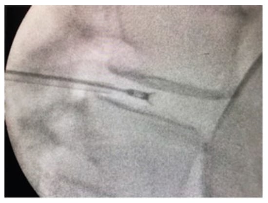 The device, intervention, and follow-up protocol have been extensively described in a previous publication. For full details, see Canós-Verdecho et al., 2022 [20]. A fluoroscopic image taken during one of the interventions is shown in Figure 2. Intervention dates were from 8 July 2021 to 9 December 2021, and the final follow-up was completed in December 2022.