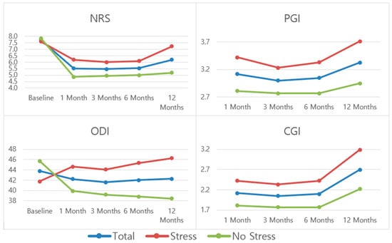 Table 2 and Figure 3 show the scores for NRS, ODI, PGI, and CGI outcomes at the established follow-up time periods, while Table 3 and Figure 4 present scores at the established follow-up time periods for SF-12. For the scoring trend throughout the follow-up period for the entire sample, statistically significant differences were observed for NRS and all SF-12 outcomes. If the trends among the stress groups are compared, statistically significant differences were observed for all pain and function-related outcome measures except for SF-12 Physical.