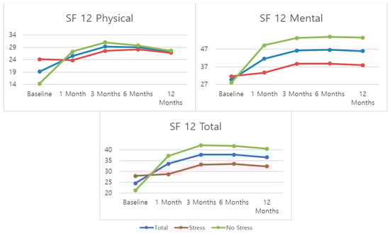 For quality of life (SF-12), the biggest improvement is seen at the 1-month mark and from there, the trend is for a stabilization of the scores. Scores for the mental SF-12 subscale are significantly better than those for the physical subscale. When compared by stress groups, the “no stress” group presented significantly better scores for all three SF-12 outcomes than the “stress” group.