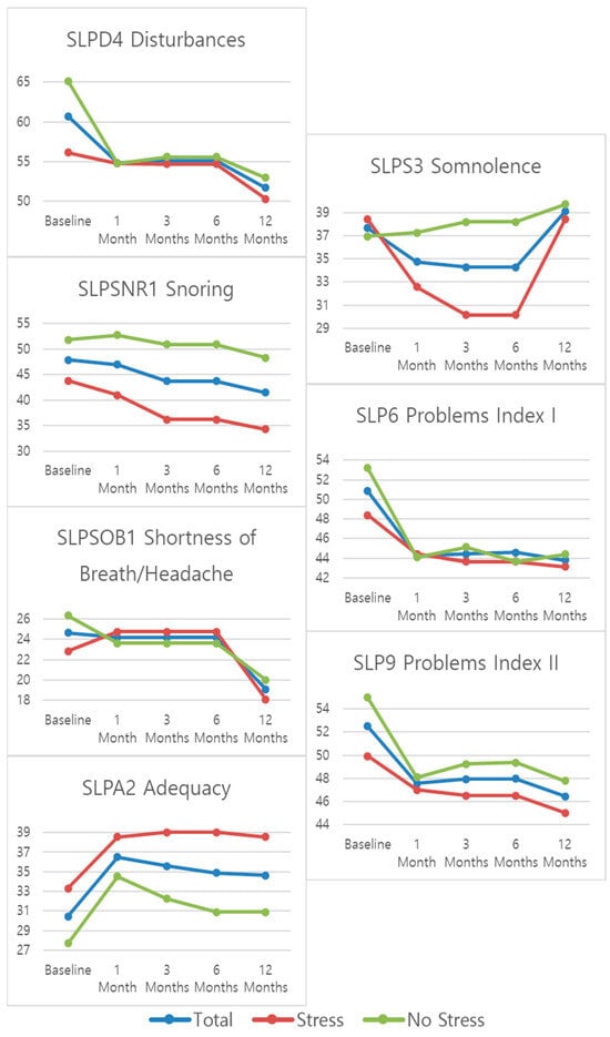 Table 4 and Figure 5 show the mean ± standard deviations scores for the MOS Sleep Scale outcomes at the established follow-up time periods. A statistically significant change during the follow-up was observed for all sleep-related outcome measures in at least one of the studied groups except for “sleep adequacy” (SLPA2) and “daytime somnolence” (SLPS3). The trend for all sleep-related outcomes is for improvement at the 12-month mark, with the biggest change observed at the 1-month mark. For “sleep disturbance”, “sleep awakening short of breath or with headache”, and “daytime somnolence”, a significant change can also be observed between the 6- and 12-month marks. For “sleep disturbance” and “sleep awakening short of breath or with headache”, the change is a further improvement in scores, but for “daytime somnolence”, there is a worsening between the 6- and 12-month marks, especially for the “stress” group. When it comes to the sleep problems indexes (SLP6 and SLP9) both present an initial improvement that appears to stabilize over the follow-up period.