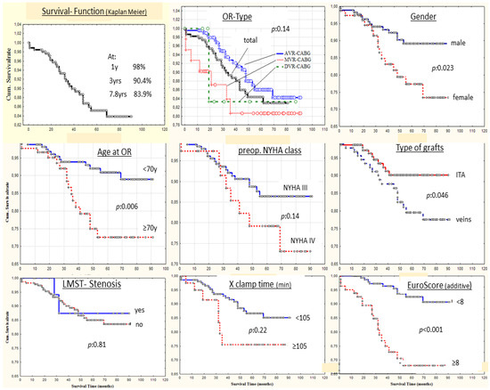 Survival function (Kaplan–Meier). Survival analysis at 94 months (Kaplan–Meier function) evaluating the impact of several variables.Abbreviations. Cum.: cumulative; ITA: internal thoracic artery; LMST: left main stem; others as previously stated.