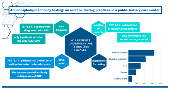 Antiphospholipid antibodies are a heterogeneous group of autoantibodies that are directed against phospholipid-binding proteins. Those antibodies are detected using different assays that have varying degrees of sensitivity and specificity. The ones that are currently included in the classification criteria are lupus anticoagulant (LAC), anticardiolipin antibodies (aCL) IgG and IgM, and anti-B2-glycoprotein antibodies (aB2GP) IgG and IgM [3]. The testing and interpretation of these antibodies is associated with many challenges and pitfalls in clinical practice, including interference with medications, the need for repeat testing to establish persistence, the overuse of testing in specific clinical scenarios that are not necessarily evidence-based, and the misinterpretation of reported values given the different cutoffs used due to interlaboratory variations and a lack of international standards [2,4]. Current guidance does not consider weakly positive levels of aCL and aB2GP antibodies to be clinically relevant and a level at or above the 99th percentile is needed to establish positivity [3]. Although there are many studies describing the challenges around aPL testing and elaborating on best testing procedures, available assays and their shortcomings, and summarizing current consensus guidelines [5,6,7,8], to our surprise, there were not as much studies that have tried to quantify the effect of these challenges on clinical practice and patient diagnosis accuracy. An audit done by Favaloro et al. identified a wide variety of clinical ordering backgrounds and found that 27% of orders were for obstetric patients with no positive results among those patients, suggesting a need to review local testing guidelines [9].