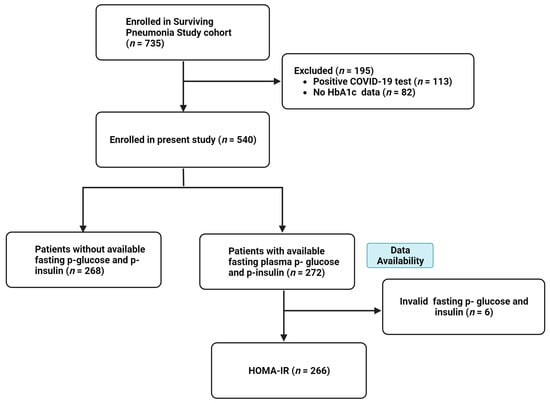 Of the 735 patients enrolled in the Surviving Pneumonia Study cohort during the study period, 195 were excluded due to a positive COVID-19 test (n = 113) or a lack of available HbA1c measurement (n = 82), leaving 540 patients included in this study (Figure 1). Of these, 272 had available fasting plasma glucose and insulin samples, allowing for the estimation of HOMA-IR. However, samples from 6 patients were deemed invalid for HOMA-IR estimation due to exogenous insulin administration during the fasting period (Figure 1). Consequently, 540 patients were included in analyses with CRP as the outcome, while 266 were included in analyses with HOMA-IR as the outcome.
