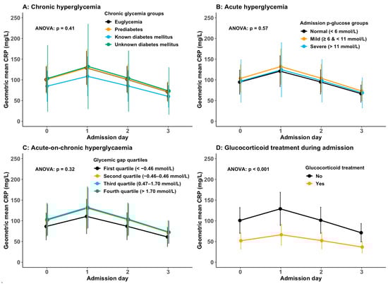 The figure shows the predicted values of geometric mean CRP with a 95% CI from admission until day 3 from linear, mixed models with age, sex, time, CURB-65 score, and corticosteroid treatment as fixed effects and patients as random effects. Predicted CRP values are stratified by chronic hyperglycaemia (A), acute hyperglycaemia (B), acute-on-chronic hyperglycaemia (C), and in-hospital glucocorticoid treatment (D). The p-value in each figure is from the analysis of variance of Type II multivariate Wald tests of fully adjusted linear mixed models for each predictor entered as a categorical variable (i.e., chronic hyperglycaemia groups, admission glucose groups, and glycaemic gap quartiles). The effect of glucocorticoid treatment was similar across the linear mixed models, and the p-value shown in (D) is from the model where chronic hyperglycaemia was the predictor.